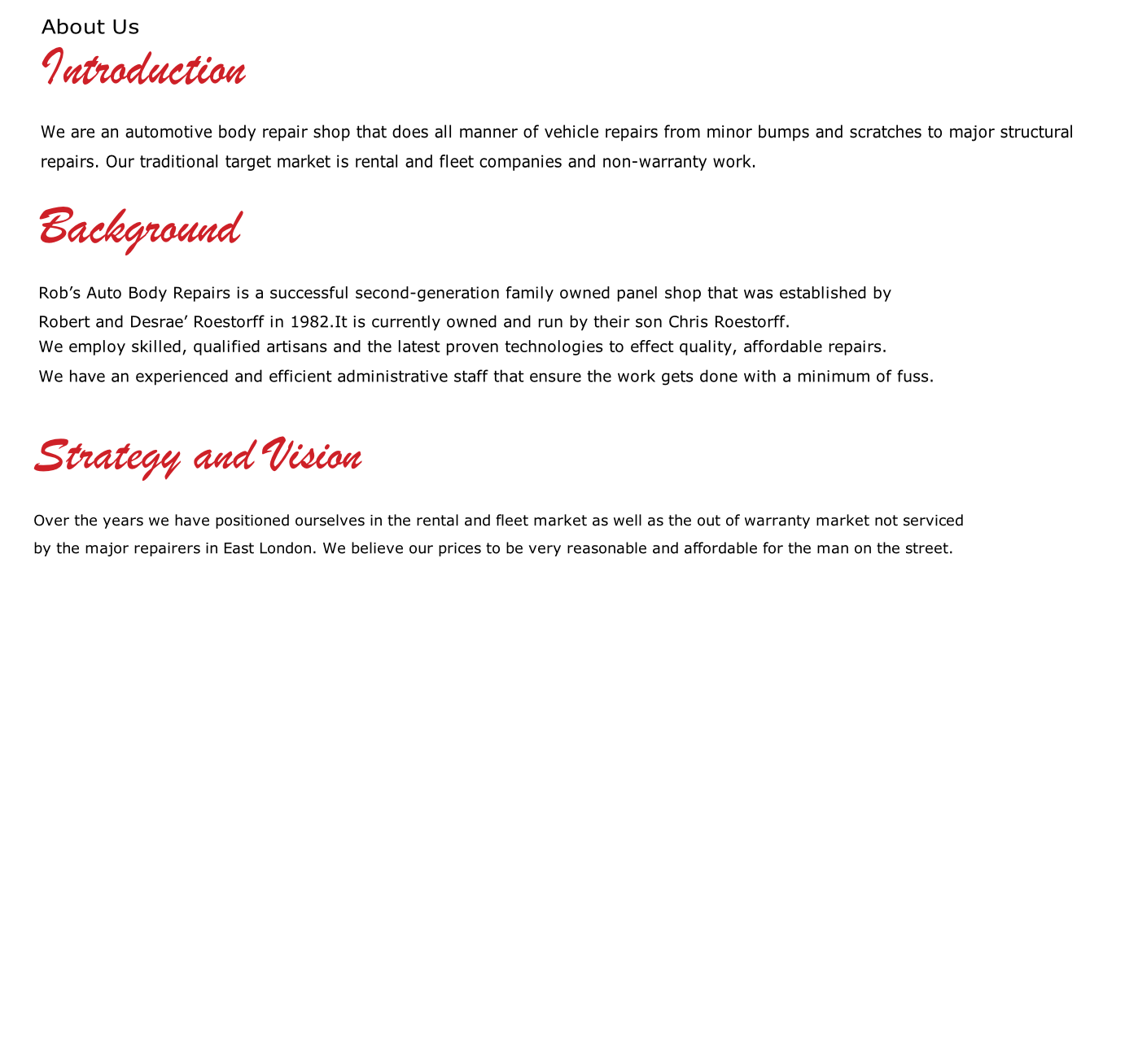 Rob’s Auto Body Repairs is a closed corporation singly owned and managed by Chris Roestorff. He has 15 plus years’ experience in the trade and has 8 plus years running the business since taking over from his father.